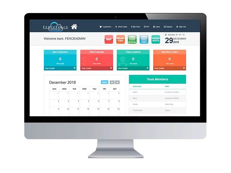 An ERP application for the Fence construction industry with features like customer management, work order scheduling and management, bid management, proposal management, RFIs, user management, location management with Google API, foreman scheduling, advanced search options, work items, site sheet, FDAs, purchase order, material management, quote management, generate various kind of reports and more.